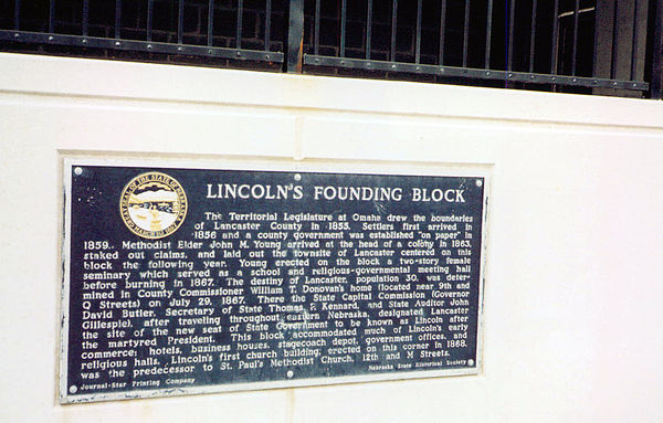 The Territorial Legislature at Omaha drew the boundaries of Lancaster County in 1855. Settlers first arrived in 1856 and a county government was established "on paper" in 1859. Methodist Elder John M. Young arrived at the head of a colony in 1863, staked out claims, and laid out the townsite of Lancaster centered on this block the following year. Young erected on the block a two-story female seminary which served as a school and religious-governmental meeting hall before burning in 1867. The destiny of Lancaster, population 30, was determined in County Commissioner William T. Donovan's home (located near 9th and Q Streets) on July 29, 1867. There the State Capital Commission (Governor David Butler, Secretary of State Thomas P. Kennard, and State Auditor John Gillespie), after traveling throughout eastern Nebraska, designated Lancaster the site of the new seat of State Government to be known as Lincoln after the martyred President. This block accommodated much of Lincoln's early commerce: hotels, business houses, stagecoach depot, government offices, and religious halls. Lincoln's first church building, erected on this corner in 1968, was the predecessor to St. Paul's Methodist Church, 12th and M Streets.