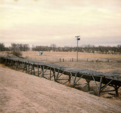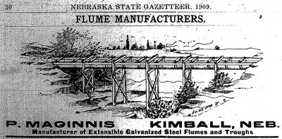 In 1910 the Kimball Irrigation District voted to construct an irrigation system with a reservoir and two canals. The rough topography traversed by the canals required several aqueducts, which used flumes manufactured in Kimball, Nebraska, by Patrick Maginnis. He began building flumes in the late 1890s and soon developed the patented Galvanized Steel Flume. The Maginnis Flume Factory opened shortly thereafter, and produced flumes for projects throughout the region. This flume is listed in the National Register of Historic Places.