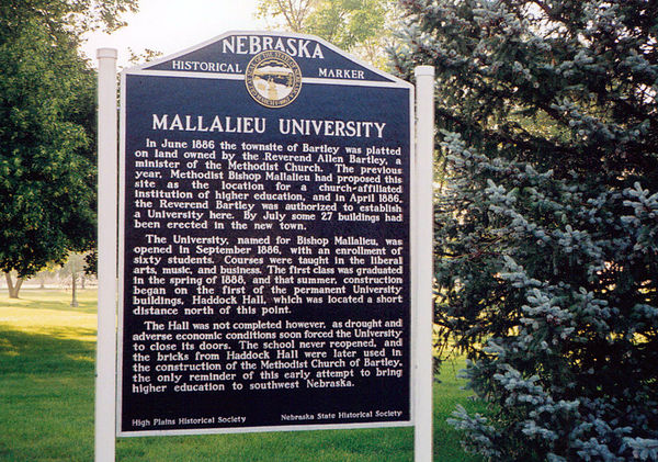 In June, 1886, the townsite of Bartley was platted on land owned by the Reverend Allen Bartley, a minister of the Methodist Church. The previous year, Methodist Bishop Mallalieu had proposed this site as the location for a church-affiliated institution of higher education, and in April, 1886, the Reverend Bartley was authorized to establish a University here. By July, some 27 buildings had been erected in the new town.