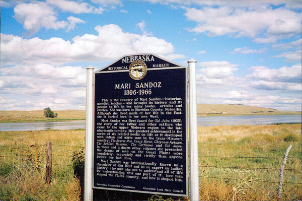 This is the country of Mari Sandoz--historian, novelist, teacher--who brought its history and its people to life in her many books, articles and stories. She was born in Sheridan County, Nebraska. Although she lived much of her life in the East, she is buried here in her own West. Mari Sandoz was first famed for Old Jules (1935), the story of her father and other settlers who came to the upper Niobrara region in the late nineteenth century. Her greatest achievement is the series of six related books on life as it developed with Indian and white men in the trans-Missouri country: The Beaver Men, Crazy Horse, Cheyenne Autumn, The Buffalo Hunters, The Cattlemen and Old Jules. In these and a dozen other volumes she presented the drama of man on the Great Plains more completely, accurately and vividly than anyone before her had done. Mari Sandoz was internationally known as a chronicler of the West and as an expert on Indian history. Her own aim was to understand all of life by understanding this one part of it: how man shaped the Plains country, and how it shaped him.