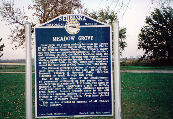 Near here at a point midway between the source of the Elkhorn River and its entry into the Platte, is the town of Meadow Grove. The Elkhorn Valley has long been an important passageway for travelers and settlers. In 1739, the Mallet brothers made the first recorded journey through this region. James Mackay, employed by the Spanish, came through part of the Elkhorn Valley in 1796. These early explorers named the river Corne de Cerf, French for "Elk's Horn."