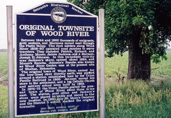 Between 1844 and 1866 thousands of emigrants, gold seekers, and Mormons moved west through the Platte Valley. The first settlers along Wood River 1858-60 operated road ranches to serve travelers. They included Patrick, Richard, and Anthony Moore; James Jackson; and a Mormon, Joseph E. Johnson. In this immediate vicinity was Jackson's store, opened about 1864, and Moore's Ranche. Johnson's Ranche, also known as Wood River Center, was at the present site of Shelton, Nebraska. The original town of Wood River, named for the tree-lined river directly north, was platted around a station established here by the Union Pacific Railroad in 1866. Jackson moved his store to the settlement, and a log Catholic Church and settlers' school were built by 1869. In 1874-75 the Union Pacific platted the present town of Wood River about three miles east. The station, post-office, and Jackson's store were placed on skids and moved to the new location. In 1990 only St. Mary's Cemetery and the District 5 school marked the original townsite.