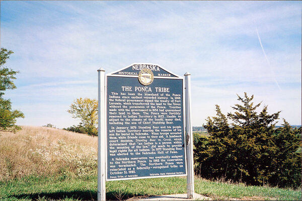 This is the homeland of the Ponca Indians who have lived in this area since earliest recorded history. In 1868, the federal government signed the Treaty of Fort Laramie which transferred the land to the Sioux without the permission of the Ponca. Treaties made with the government in 1858 had guaranteed their land to them. The Ponca were forcibly removed to Indian Territory in 1877. Unable to adjust to the climate of the South, many became ill and died. Among these was the son of Chief Standing Bear. In January 1879, the chief and his small band left Indian Territory bearing the remains of his son for burial in Nebraska. When troops arrested the small band, white friends came to their aid. As a result of a court decision it was determined that "an Indian is a person within the meaning of the law." This important action did much to provide legal rights for all Indians. A Nebraska reservation was eventually assigned to the Northern Ponca while many of the Southern Ponca remained in Oklahoma. In 1962, at the request of the Ponca, Congress provided for a termination of the reservation. Today the Ponca can be proud of their fight for justice. In 1977, Chief Standing Bear was elected to the Nebraska Hall of Fame in the State Capitol.