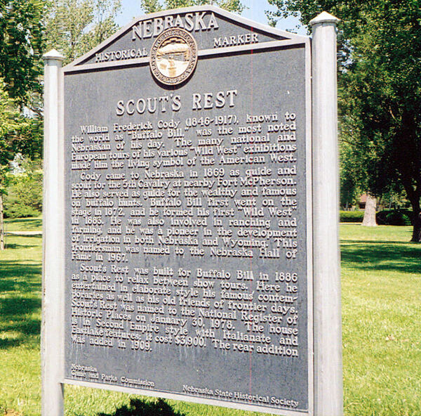 William Frederick Cody (1846-1917), known to the world a "Buffalo Bill," was the most noted Nebraskan of his day. The Many national and European tours of his various "Wild West" exhibitions made him the living symbol of the American West. Cody came to Nebraska in 1869 as guide and scout for the 5th Cavalry at nearby Fort McPherson. He also served as guide for the wealthy and famous on buffalo hunts. Buffalo Bill first went on the stage in 1872, and he formed his first "Wild West" in 1883. He was also involved in ranching and farming, and he was a pioneer in the development of irrigation in both Nebraska and Wyoming. Scout's Rest was built for Buffalo Bill in 1886 as a place to relax between show tours. Here he entertained in elaborate style his famous contemporaries as well as his old friends of frontier days. Scout's Rest was named to the National Register of Historic Places on January 30, 1978. The house is in Second Empire style with Italianate and Eastlake features; it cost $3,900. The rear addition was added in 1909.