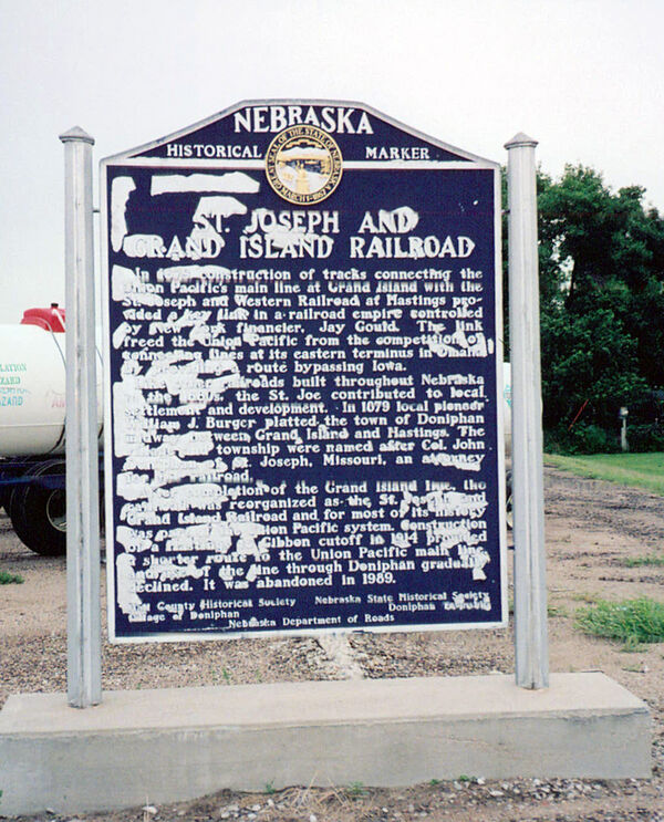 In 1879 construction of tracks connecting the Union Pacific's main line at Grand Island with the St. Joseph and Western Railroad at Hastings provided a key link in a railroad empire controlled by New York financier, Jay Gould. The link freed the Union Pacific from the competition of connecting lines at its eastern terminus in Omaha by providing a route bypassing Iowa. Like other railroads built throughout Nebraska in the 1880s, the St. Joe contributed to local settlement and development. In 1879 local pioneer William J. Burger platted the town of Doniphan midway between Grand Island and Hastings. The village and township were named after Col. John Doniphan of St. Joseph, Missouri, an attorney for the railroad. After completion of the Grand Island line, the railroad was reorganized as the St. Joseph and Grand Island Railroad and for most of its history was part of the Union Pacific system. Construction of a Hastings to Gibbon cutoff in 1914 provided a shorter route to the Union Pacific main line, and use of the line through Doniphan gradually declined. It was abandoned in 1989.