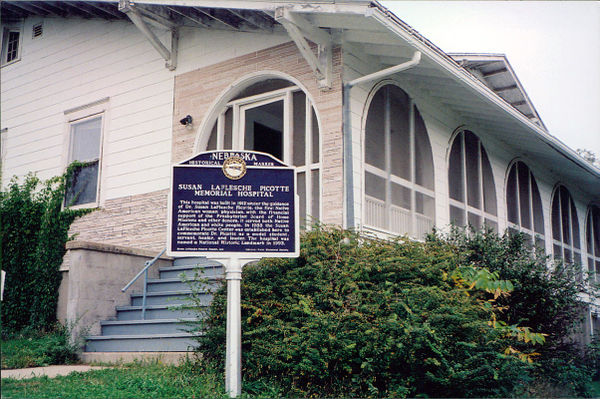 This hospital was built in 1912 under the guidance of Dr. Susan La Flesche Picotte, the first Native American woman physician, with the financial support of the Presbyterian Board of Home Missions and other donors. It served both Native American and white people. In 1988 the Susan La Flesche Picotte Center was established here to commemorate Dr. Picotte as a model student, servant, healer, and leader. The hospital was named a National Historic Landmark in 1993.
