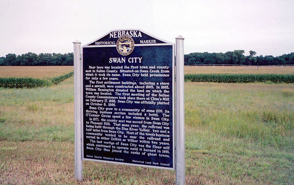Near here was located the first town and county seat in Saline County. Situated on Swan Creek from which it took its name, Swan City held prominence for only a few years. The first settlement buildings, including a store and a sawmill, were constructed about 1865. In 1865, William Remington donated the land on which the town was located. The first meeting of the Saline County Commissioners took place there at Cline's Mill on February 17, 1866. Swan City was officially platted on October 8, 1866. Swan City grew to a community of some 200. Its thriving business section included a hotel. The O'Connor Circus spent a few winters in Swan City. In 1871, the county seat was moved from Swan City to Pleasant Hill. That same year, the railroad was being built through the Blue River Valley, two and a half miles from Swan City. Most of the town's business community wanted to be near the railroad and moved to either DeWitt or Wilber within two years. The last vestige of Swan City was the flour mill which continued to operate until it burned in 1891. Swan City thus joined the ranks of ghost towns.