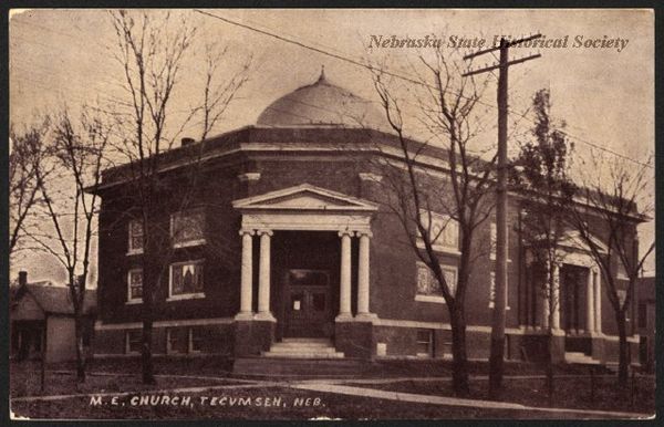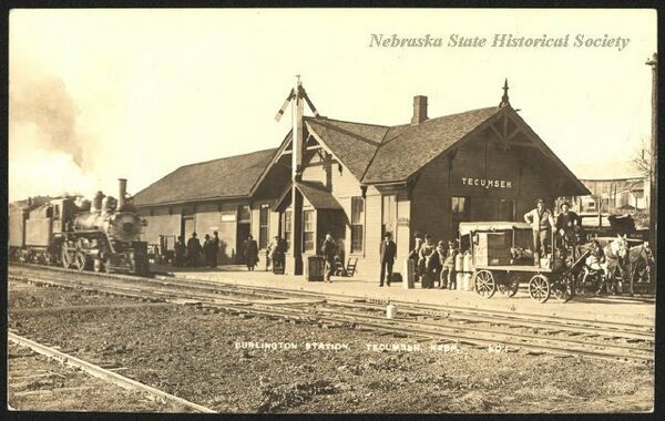 Tecumseh, the county seat of Johnson County, was incorporated in 1856. It was first called Frances in honor of the wife of Colonel Richard M. Johnson, for whom the county is named. In 1857 the town was renamed for the famous Shawnee Indian chief, Tecumseh, whom Johnson fought during the War of 1812. This historic marker is on the original townsite on the old Brownville Fort Kearney trail. Growth was slow until the mid-1860s when the lucrative freighting traffic along these trails was channeled through the town. Development accelerated after the arrival of the Atchison and Nebraska Railroad in 1872 and was further stimulated ten years later by the extension of the Republican Valley line. Tecumseh's downtown district has been enrolled on the National Register of Historic Places and contains several distinguished examples of nineteenth century architectural styles. These include the old jail, built around 1872, and the City Hall and Courthouse, both constructed in 1889. Another noteworthy building, the 1889 Christian Church, is now the headquarters of the Johnson County Historical Society. Tecumseh's distinctive buildings stand as symbols of the community's past.