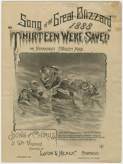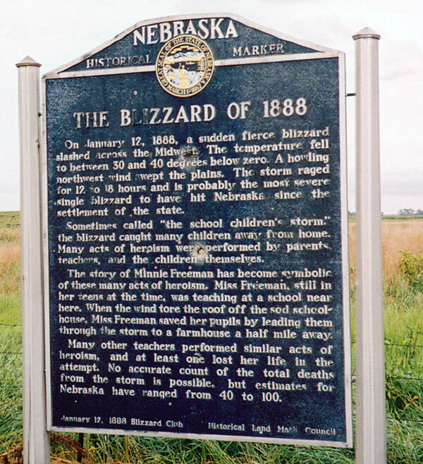 On January 12, 1888, a sudden fierce blizzard slashed across the Midwest. The temperature fell to between 30 and 40 degrees below zero. A howling northwest wind swept the plains. The storm raged for 12 to 18 hours and is probably the most severe single blizzard to have hit Nebraska since the settlement of the state. Sometimes called "the school children's storm," the blizzard caught many children away from home. Many acts of heroism were performed by parents, teachers, and the children themselves. The story of Minnie Freeman has become symbolic of these many acts of heroism. Miss Freeman, still in her teens at the time, was teaching at a school near here. When the wind tore the roof off the sod schoolhouse, Miss Freeman saved her pupils by leading them through the storm to a farmhouse a half mile away. Many other teachers performed similar acts of heroism, and at least one lost her life in the attempt. No accurate count of the total deaths from the storm is possible, but estimates for Nebraska have ranged from 40 to 100.