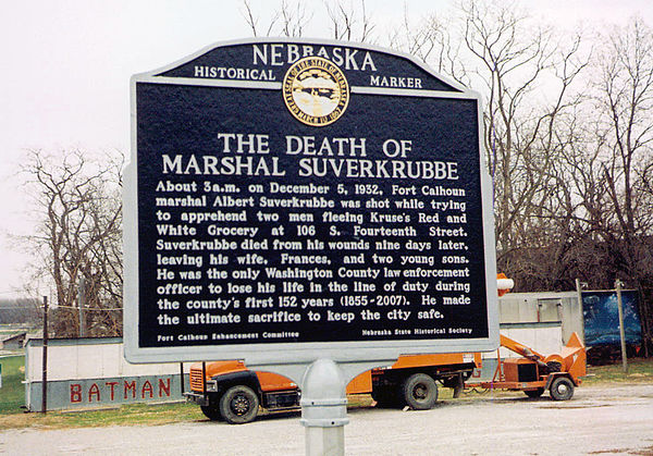About 3 a.m. on December 5, 1932, Fort Calhoun marshal Albert Suverkrubbe was shot while trying to apprehend two men fleeing Kruse's Red and White Grocery at 106 S. Fourteenth Street. Suverkrubbe died from his wounds nine days later, leaving his wife, Frances, and two young sons. He was the only Washington County law enforcement officer to lose his life in the line of duty during the county's first 152 years (1855-2007). He made the ultimate sacrifice to keep the city safe.