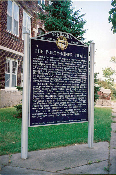 During the nineteenth century the United States underwent a dramatic westward expansion, but perhaps no single event stimulated this mass migration more than the 1848 discovery of gold at Sutter's Mill in California. Hundreds of thousands of Americans were struck with "the fever." While some chose to sail to California on the famed Clipper Ships, the vast majority of gold seekers journeyed overland from the Missouri River feeder towns of Independence, St. Joseph, and Council bluffs. Through Nebraska, most travelers followed the established Oregon Trail which also became known as the California or "Forty-Niner" Trail. The Forty-Niner Trail entered Thayer County near present-day Alexandria and followed the Big Sandy Valley where water, wood, and grass was available. After crossing the Big Sandy near Belvidere the trail proceeded in a southwesterly direction to the banks of the Little Blue. After the establishment of Thompson's Station a few miles south of Belvidere the trail followed the Eighteen Mile Ridge across Thayer County. The route was later used by the Pony Express, freighters, overland stage companies and the railroads. The trip to California was long and arduous, with disease, heat, lack of water, and Indian threats the constant dangers. The call to adventure, possible riches, or a new home in a new land encouraged these hardy pioneers to make the journey along the Forty-Niner Trail.