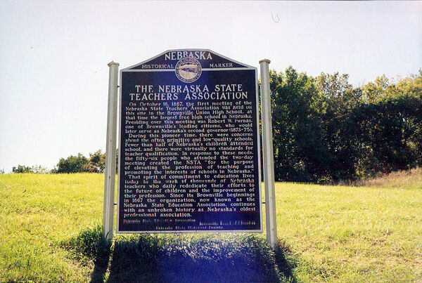 On October 16, 1867, the first meeting of the Nebraska State Teachers' Association was held on this site in the Brownville Union High School, at that time the largest free high school in Nebraska. Presiding over this meeting was Robert W. Furnas, one of Brownville's leading citizens, who would later serve as Nebraska's second governor (1873-75). During this pioneer time, there were concerns about the often primitive and low-quality schools. Fewer than half of Nebraska's children attended school, and there were virtually no standards for teacher qualification. In response to these needs, the fifty-six people who attended the two-day meeting created the NSTA "for the purpose of elevation the profession of teaching and promoting the interests of schools in Nebraska." That spirit of commitment to education lives today in the work of thousands of Nebraska teachers who daily rededicate their efforts to the future of children and the improvement of their profession. Since its Brownville beginnings in 1867 the organization, now known as the Nebraska State Education Association, continues with an unbroken history as Nebraska's oldest professional association.