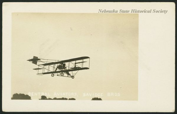 Near here was the scene of some of Nebraska's earliest experiments with flight in a heavier-than-air vehicle. Sometime before late 1907, Martin P. Savidge's sons set out to construct a flying machine. They began by studying hawks, then went on to build model gliders, then full size gliders, and finally a self-powered airplane. The first public demonstration was successfully held on Sunday, May 7, 1911. Following this success, the brothers spent five years barnstorming throughout the Great Plains. Matt Savidge was among the first to develop a method of skywriting. During these five years, the brothers built and flew three different biplanes. After a barnstorming tour through Texas, the brothers returned home in the spring of 1916 to make repairs and adjustments on their plane. During a test flight on June 17, 1916, the plane crashed, killing Matt Savidge. After this tragedy, the family of the young fliers insisted that they give up their dangerous pastime. Thus ended one of the earliest chapters of Nebraska aviation history.