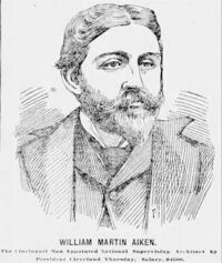 William Martin Aiken was born in Charleston, South Carolina on April 1, 1885, son of Joseph Daniel Aiken.[1] The Aikens were politically prominent, with two cousins who served as Congressmen from South Carolina, one of whom was also the state's governor.[a]. William Martin attended the University of the South in Charleston from 1872-1874, then taught at Charleston's high school and at University of the South until 1877, while already being listed as an architect in Charleston city directories of 1877 and 1878.[b]. He next studied architecture at Massachusetts Institute of Technology, graduating in 1879. He resided in Brookline, Massachusetts, where the city directory listed him as an architect in 1882 and 1883, and he became active in Democratic politics and the "Brookline Battalion." At the same time, Boston city directories listed him as a draughtsman for Boston architects, which later reported including William Ralph Emerson and H. H. Richardson.[c] Aiken relocated to Cincinnati where he established his own practice by 1886. In 1895 he was appointed the Supervising Architect of the Treasury. His brief, two-year tenure in that post included a coast-to-coast tour, visiting federal building projects including in Omaha, Nebraska, and producing substantial public buildings in Connecticut, Pennsylvania, Minnesota, and Colorado.[6][7][d] Upon Aiken's resignation in 1897, he settled in New York City, where his practice included private and public commissions. A lifelong bachelor, Aiken died in New York City December 7, 1908.[1][2]